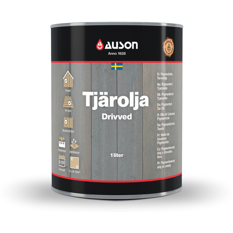 Olej z dřevního téru v odstínu naplavené dřevo od švédského výrobce Auson pro dlouhodobou ochranu dřeva ve venkovním prostředí. Plochy chrání po dobu minimálně 6 - 8 let. Zachovává viditelnou strukturu dřeva. Ideální pro dřevěné obložení domů, zahradní nábytek, sruby, ploty, pergoly, dřevěné terasy, ale také mola a další. Je bezpečný pro životní prostředí, vhodný také pro truhlíky, vyvýšené záhony a biofarmy. Svým vzhledem a životností nemá mezi nátěry srovnání.